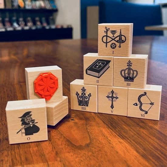 マルセイユ版タロットの大アルカナ「魔術師」の絵柄をモチーフにした、木製のスタンプです。